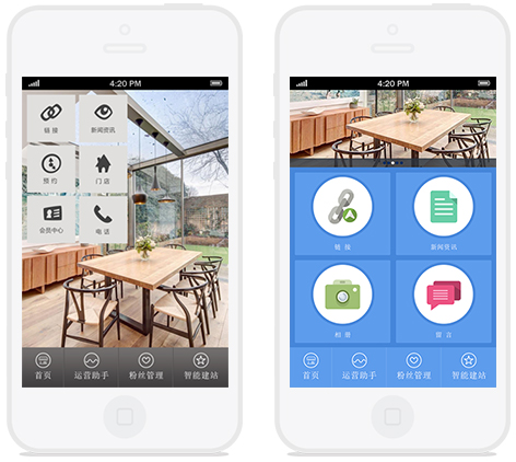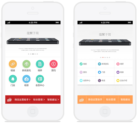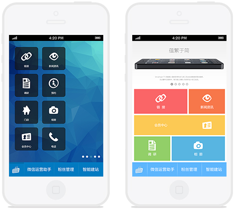 提供多套一整套的整站风格,帮助企业搭建更好地移动门户。功能有:智能建站、CRM系统、微应用、微信运营助手等。